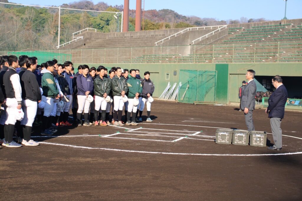 2月14日(土)関東学院大学ギオンパークにて、本部OB会による「練習球贈呈式」が行われました。OB会を代表し、藤代和孝会長、田中昇副会長が出席し、春季強化練習用として「KANTO」の文字入り硬式ボール30ダースを現役部員へ寄贈。藤代会長から主将・有川へボールが手渡され「春季リーグ戦完全優勝」「14年ぶりの全日本選手権出場」「大学日本一」への強い期待が語られました。